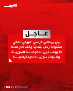 #عاجل | بريطانيا والولايات المتحدة وألمانيا وفرنسا تدعو جميع الأطراف في سوريا إلى الالتزام الصارم بوقف إطلاق النار