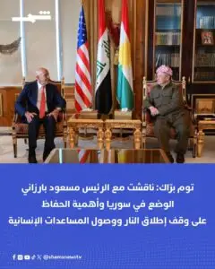 قال المبعوث الأميركي توم برّاك اليوم الاثنين إنه أجرى اتصالاً هاتفياً „مثمراً“ مع الرئيس مسعود بارزاني لمناقشة الوضع في سوريا وأهمية الحفاظ على وقف إطلاق النار وضمان تقديم المساعدات الإنسانية، لا سيما في مدينة كوباني.